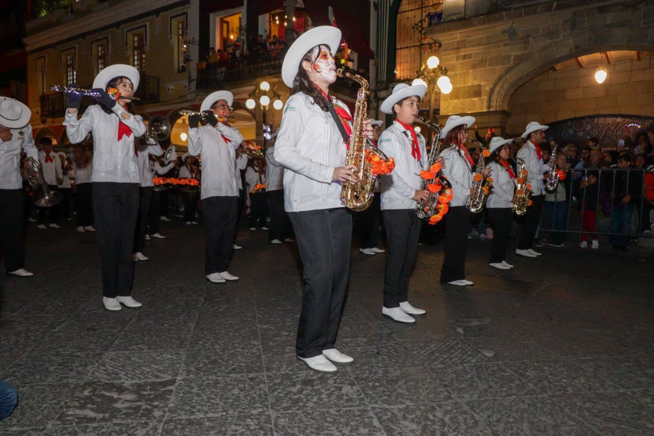 De manera paralela, las calles del Centro Histórico se llenaron de música y alegría con el Desfile de Calaveras del festival La Muerte es un Sueño, donde contingentes, comparsas y marching bands recorrieron la ciudad en una gran fiesta de color y tradición.