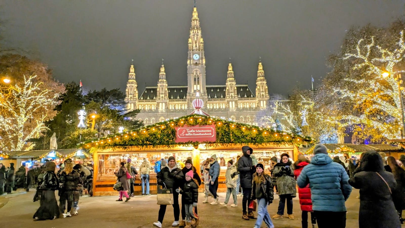 En Rathausplatz, frente al Ayuntamiento neogótico, el mercado ocupa el espacio como algo ya ensayado. Se come de pie. Las castañas asadas llegan en conos de papel todavía tibios. El Glühwein se sirve en tazas pensadas más para las manos que para la bebida. Hay un depósito por la taza: nada aquí está pensado para desaparecer enseguida. No hay exceso ni sorpresa. Los sabores no intentan impresionar. La noche avanza como si siempre hubiera sido así.