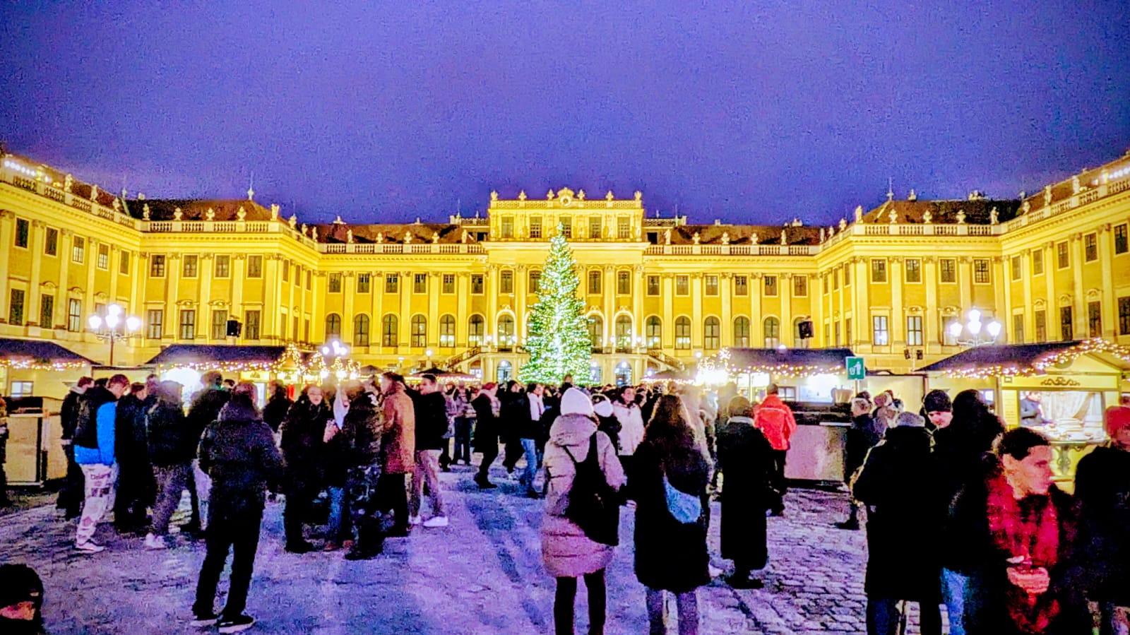 En Schönbrunn, el antiguo palacio imperial se observa desde atrás. La fachada está iluminada, pero no organiza la escena. Mandan los olores: masa horneada, especias, aceite caliente. La gente come, se calienta las manos, toma fotos familiares y sigue andando. El palacio permanece ahí, sin reclamar atención.