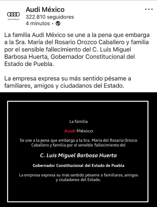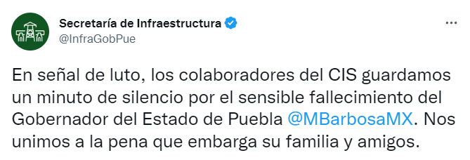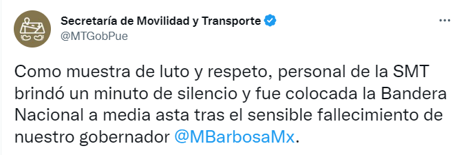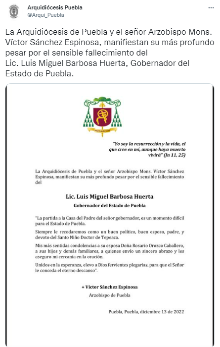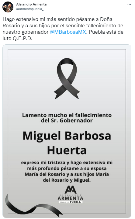 “Hago extensivo mi más sentido pésame a Doña Rosario y a sus hijos por el sensible fallecimiento de nuestro gobernador Miguel Barbosa Huerta. Puebla está de luto Q.E.P.D”, colocó en su cuenta de Twitter.