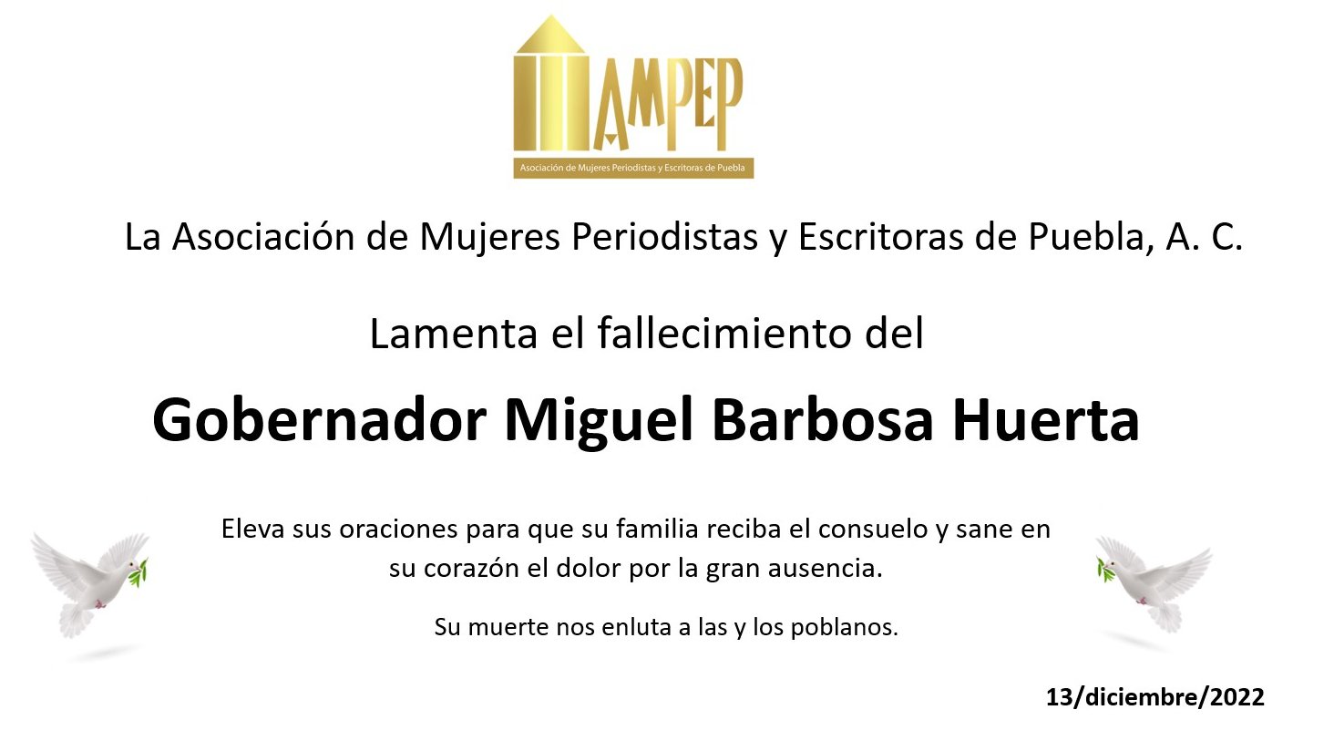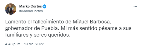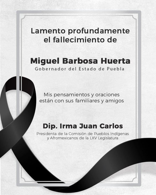 “En nombre del PRI Nacional, expresamos nuestro más sentido pésame a la familia y amigos del Gobernador Constitucional del Estado de Puebla, Miguel Barbosa Huerta. Reciban un abrazo solidario en estos momentos de profunda tristeza. Descanse en paz”.