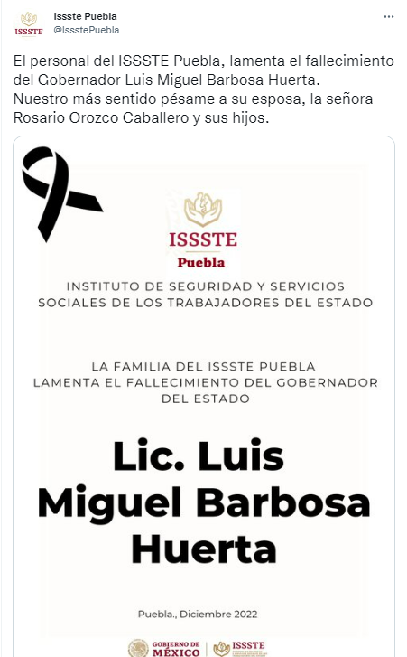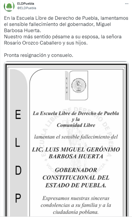 El ISSSTEP en Puebla expresó sus condolencias a la familia de Miguel Barbosa, al igual que la escuela Libre de Derecho de Puebla, la Escuela Superior de Ciencias y Humanidades, así como la Arquidiócesis de Puebla, entre otros.