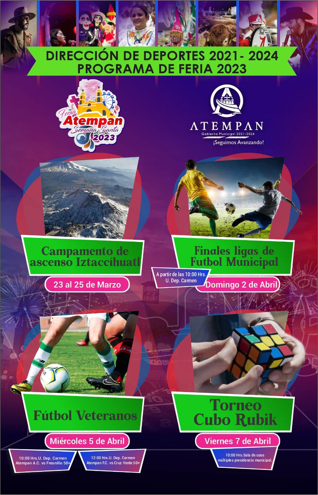 La Feria de Semana Santa de Atempan engloba actividades como cabalgatas, torneos de futbol y de cubos de Rubik, procesiones y celebraciones eucarísticas, concursos de baile huapango huasteco y de mole de torta de camarón, campamento de ascenso al volcán Iztaccíhuatl (mejor conocido como la Mujer dormida) y las presentaciones artísticas de Edgar Oceransky, Edson Zúñiga El Norteño, Gerardo Ortiz, Los Acosta, Majo Aguilar y Ximena Sariñana.