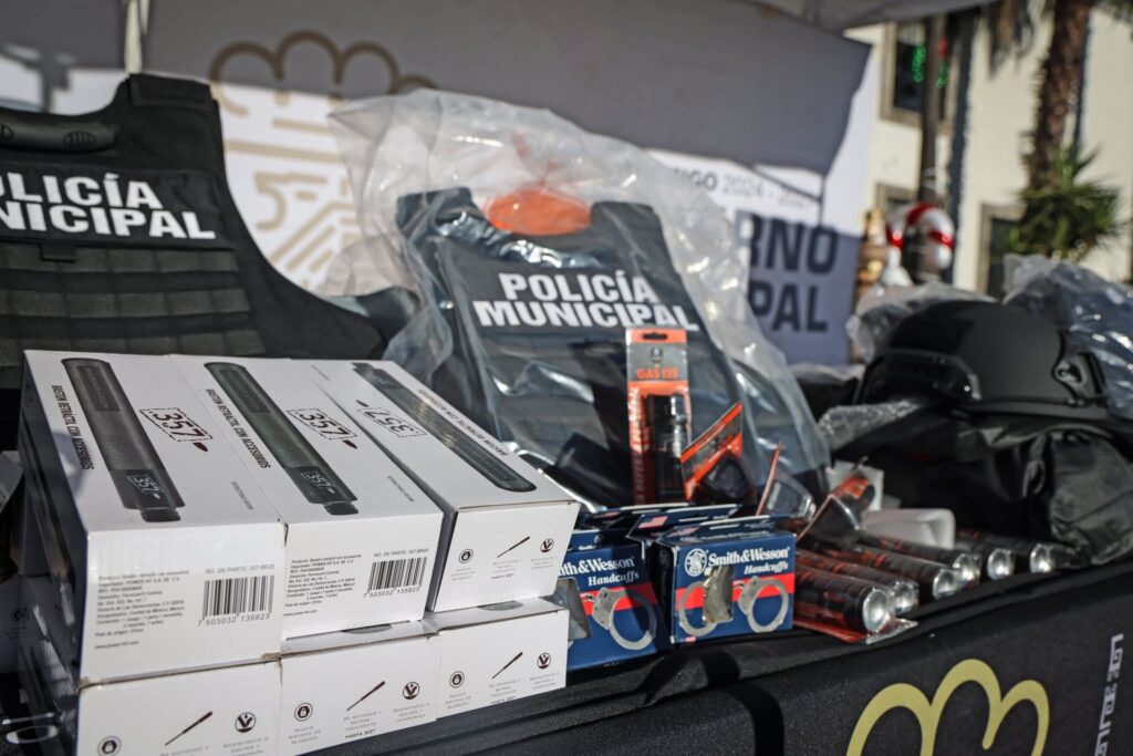 El equipamiento policial distribuido incluye uniformes completos, como pantalones, camisolas, playeras tipo polo, chamarras, cinturones y botas, así como gases pimienta, esposas, bastones retráctiles, y chalecos balísticos con placas.