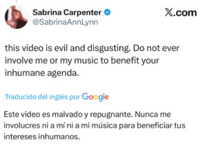 A través de la red social X, Carpenter señaló: “No me involucren nunca a mí ni a mi música en su agenda inhumana”. El fragmento empleado en el video incluye la frase “¿Alguna vez has probado esta?”, parte de un tema que originalmente expresa un deseo romántico y sexual intenso.