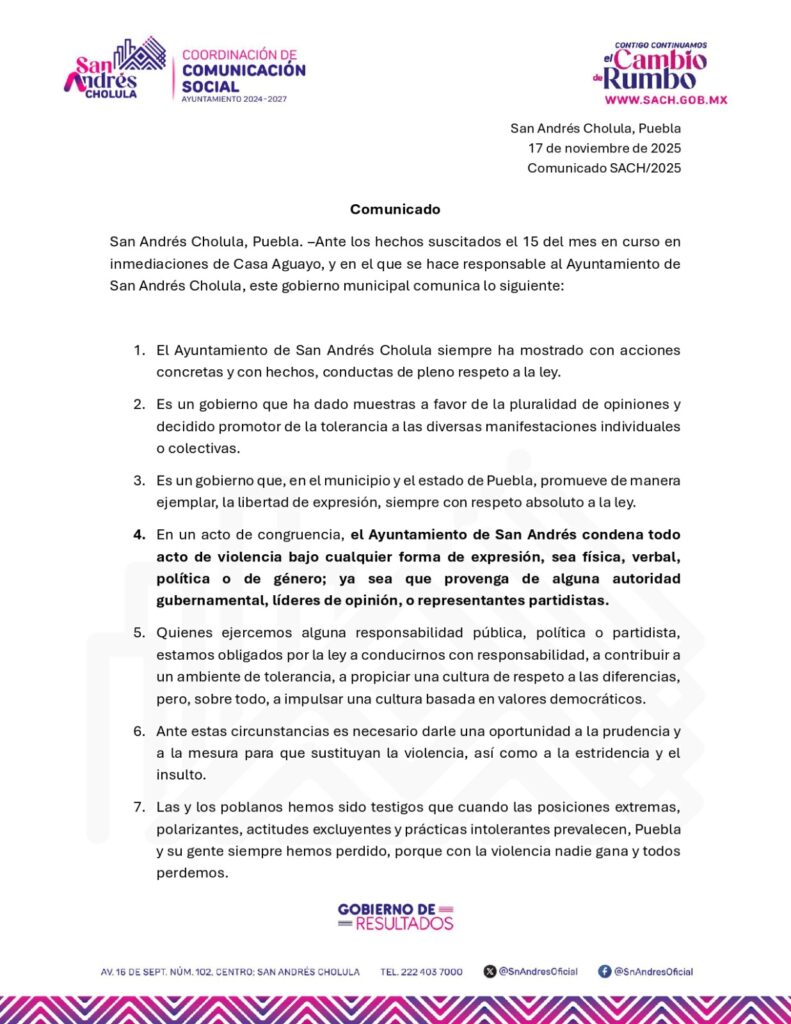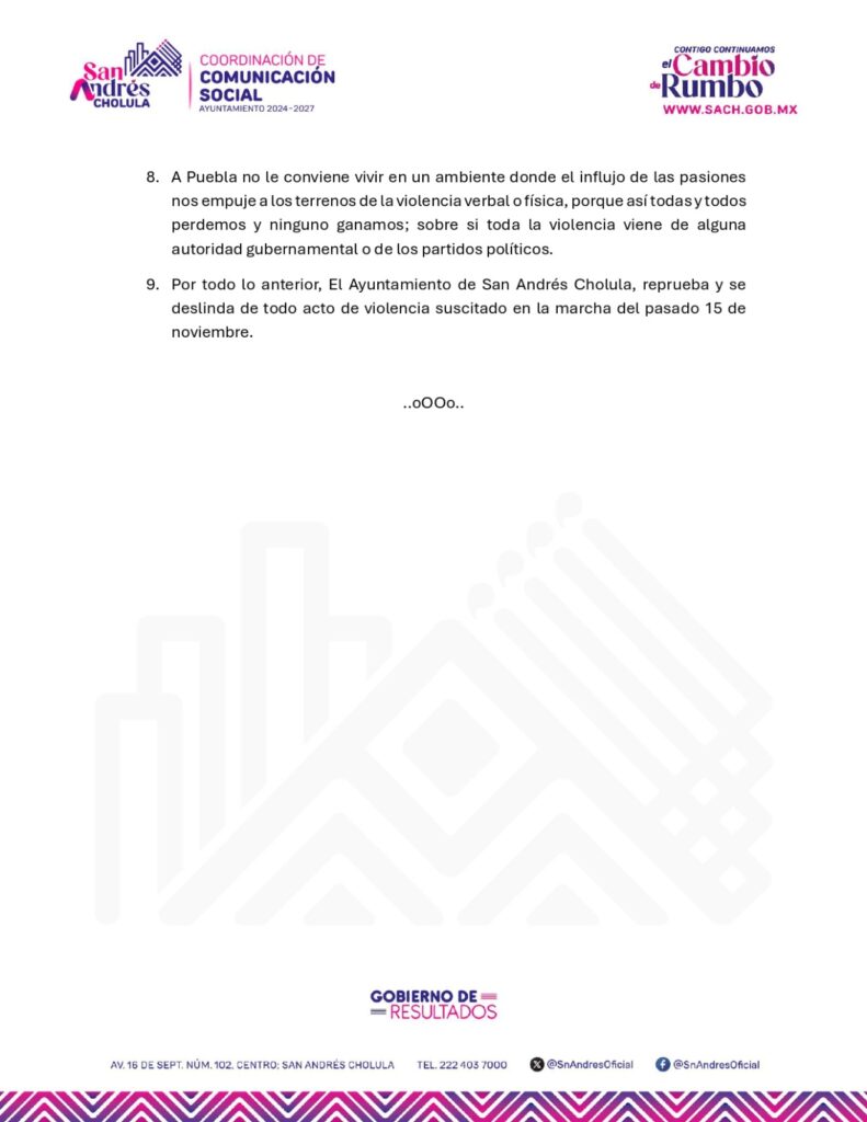 Finalmente, el gobierno de San Andrés Cholula reprobó y se deslindó de los actos de violencia ocurridos durante la marcha del 15 de noviembre, reiterando que no tuvo participación en los hechos y exhortando a evitar que el clima político derive en confrontaciones físicas o verbales.
