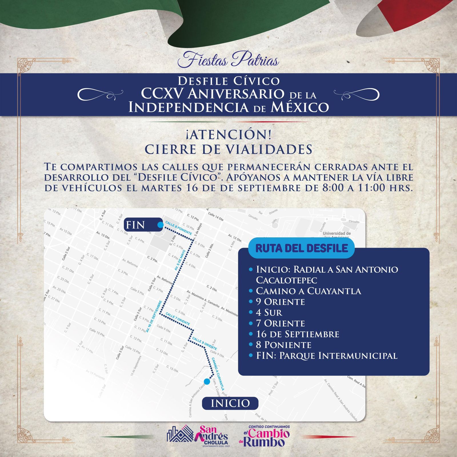 Respecto al desfile cívico del 16 de septiembre, los contingentes comenzarán a las 09:00 horas sobre la Radial a San Antonio Cacalotepec, continuando por Camino a Cuayantla, 4 Sur, 7 Oriente y 16 de septiembre, hasta incorporarse en la calle 8 Poniente y llegar al Parque Intermunicipal.