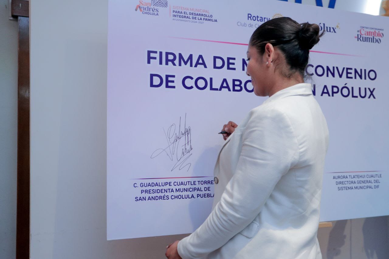 En San Andrés Cholula, Lupita Cuautle, presidenta municipal, encabezó la firma del Macro Convenio de Colaboración entre el Ayuntamiento de San Andrés Cholula y el Club Rotario de Cholula, representado por su presidente Israel Butrón Romero, con el objetivo de fortalecer la cooperación institucional e impulsar proyectos con impacto social en beneficio de la comunidad.