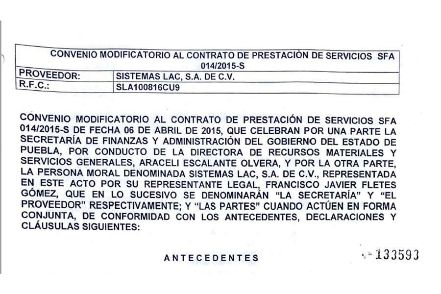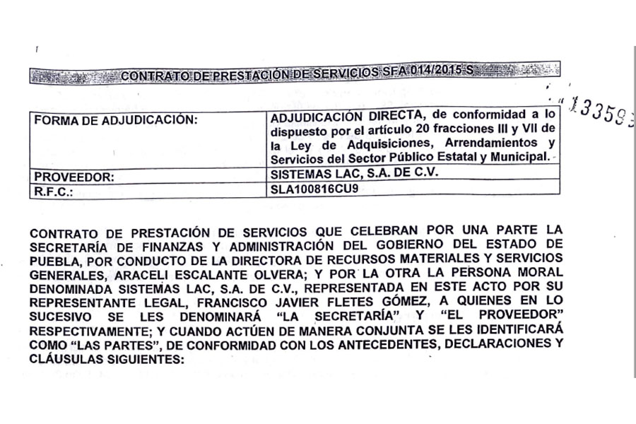 Sin embargo, en esta segunda ocasión, el contrato fue otorgado por adjudicación directa y fue firmado por Araceli Escalante Olvera, directora de Recursos Materiales y Servicios Generales de la Secretaría de Finanzas y Administración, y no por Marina Castro que se incorporó a la oficina del gobernador Moreno Valle.