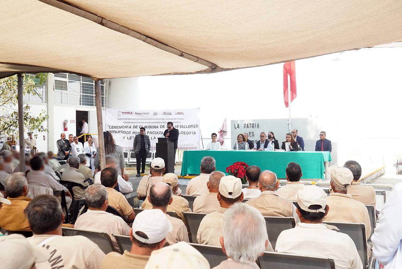La Secretaría de Seguridad Pública (SSP) y la Benemérita Universidad Autónoma de Puebla (BUAP) fortalecen las acciones de reinserción social mediante la clausura de 19 talleres educativos dirigidos a personas privadas de la libertad en el Centro Penitenciario para Personas Adultas Mayores.