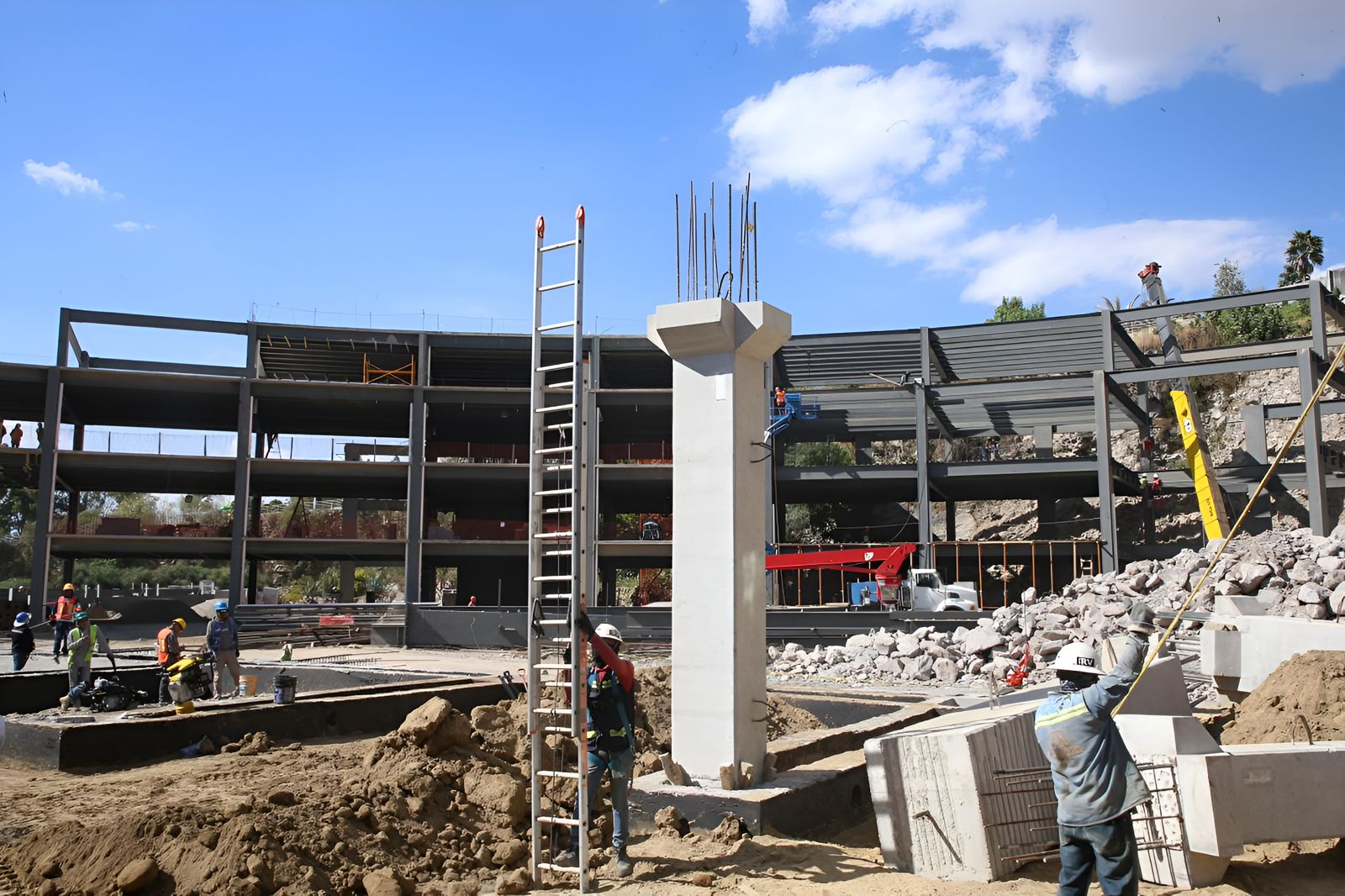 El supervisor de obra, Ángel Oliver, indicó que el complejo cumple con la normatividad vigente y avanza en áreas clave como aulas, alberca semiolímpica, auditorio y residencias estudiantiles, con labores de construcción de lunes a sábado y la participación diaria de hasta 350 trabajadores locales y foráneos.