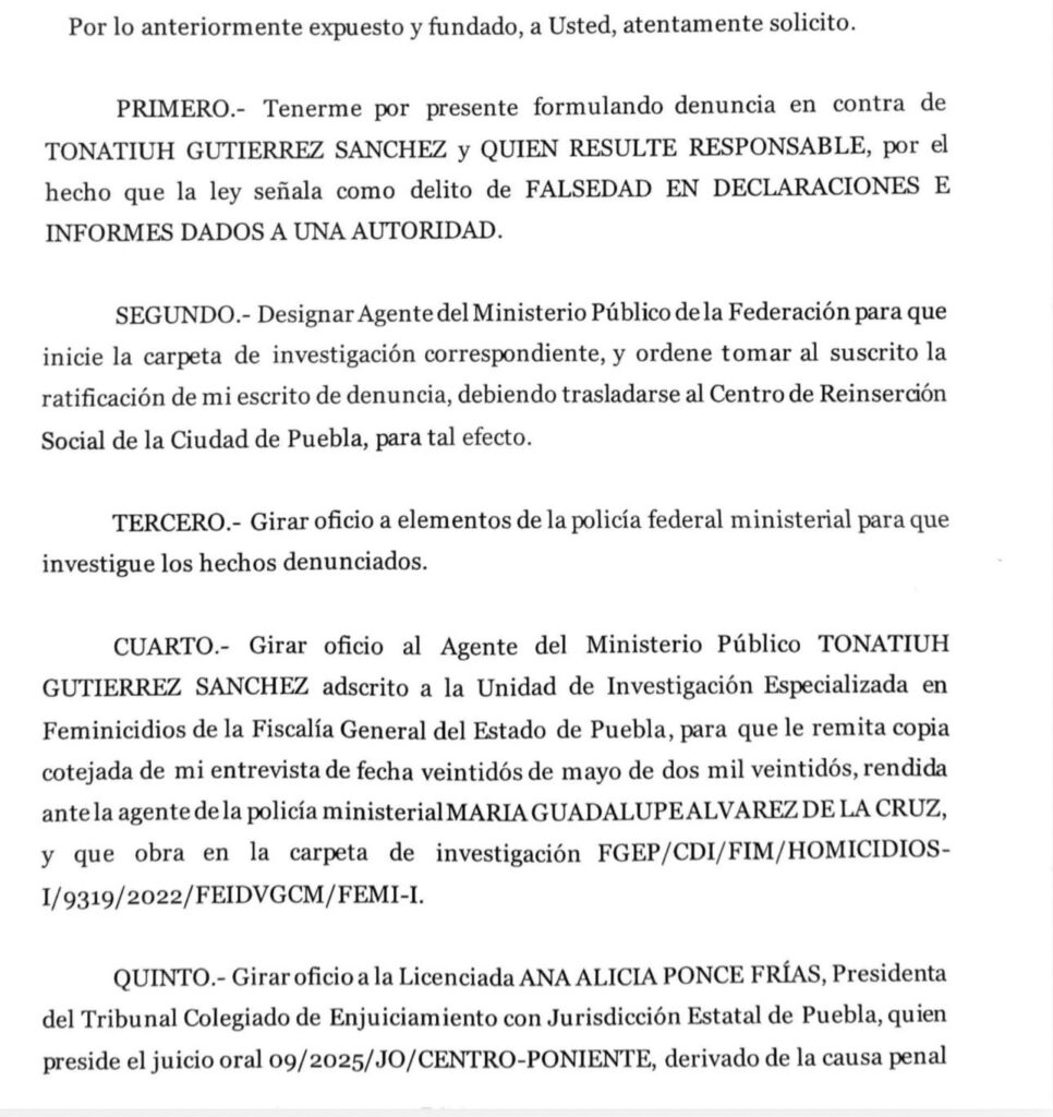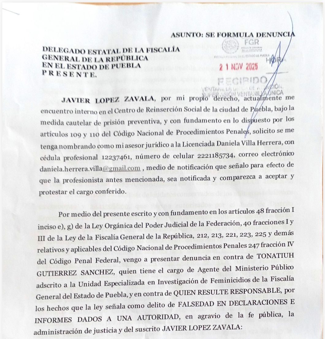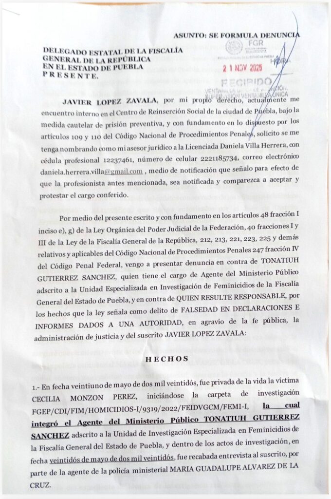 Por la fabricación de los delitos de violencia familiar y feminicidio, así como la creación de testigos falsos, falsificación de firma y falsedad en declaración, Javier López Zavala denunció ante la Fiscalía General de la República (FGR) al ministerio público Tonathiu Gutiérrez Sánchez, quien, en palabras del demandante, obedeció órdenes del exgobernador Miguel Barbosa Huerta y el exfiscal Gilberto Higuera Bernal.