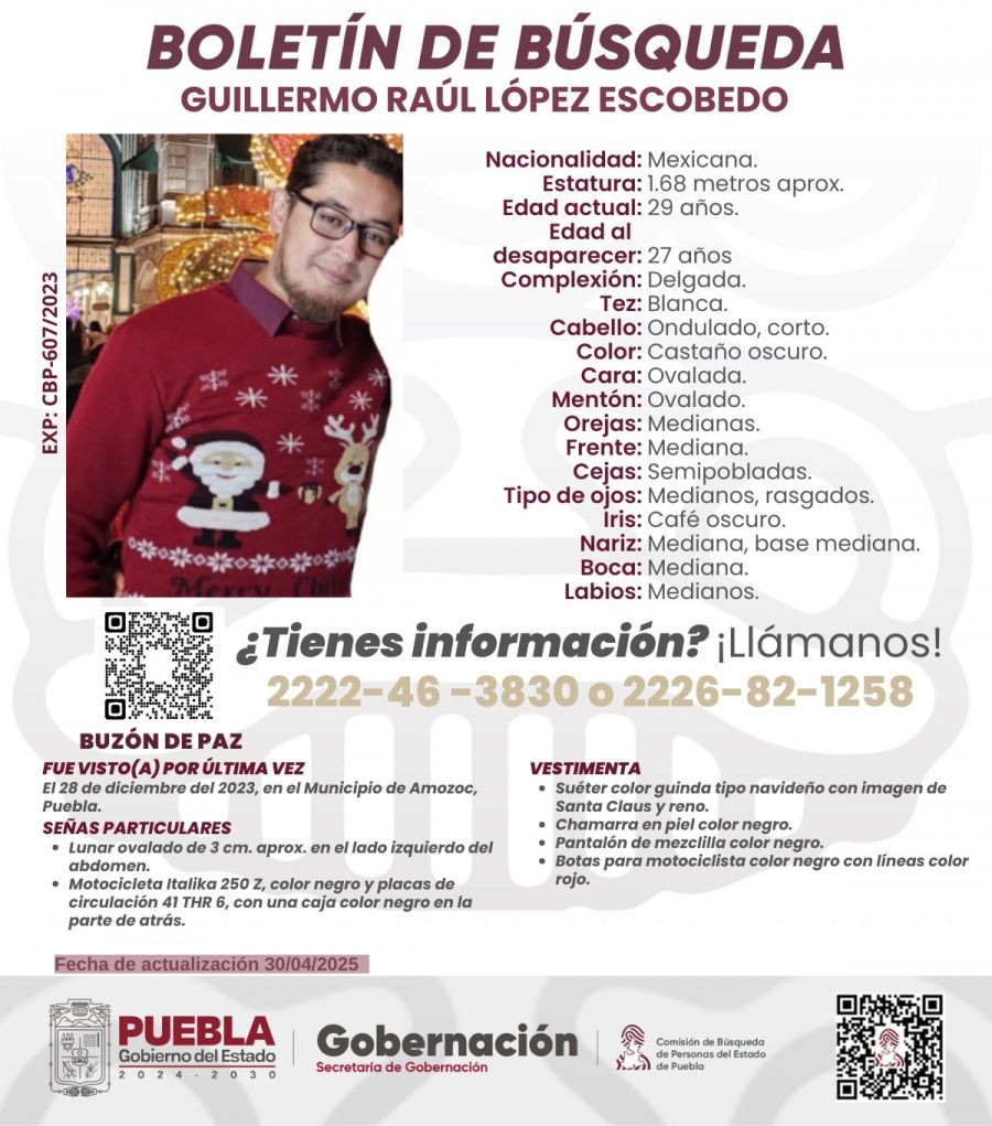 El Gobierno del Estado de Puebla, a través de la Comisión de Búsqueda de Personas, mantiene operativos permanentes y acciones conjuntas con autoridades estatales y familiares para la localización de Guillermo Raúl López Escobedo, de 27 años, reportado como desaparecido en diciembre de 2023.