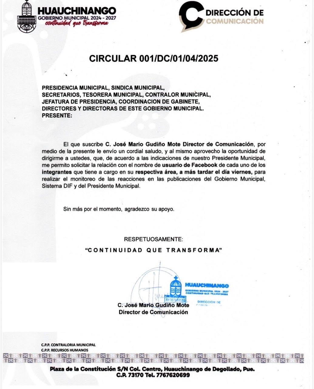 👁️ ES UNA CIRCULAR firmada por él, en la que ordena, tajantemente, a los directores de la Contraloría Municipal y de Recursos Humanos que le entreguen una “relación con el nombre de usuario de Facebook de cada uno de los integrantes que tiene(n) a cargo en su respectiva área (…) para realizar el monitoreo de las reacciones en las publicaciones del gobierno municipal, Sistema DIF y del presidente municipal”.